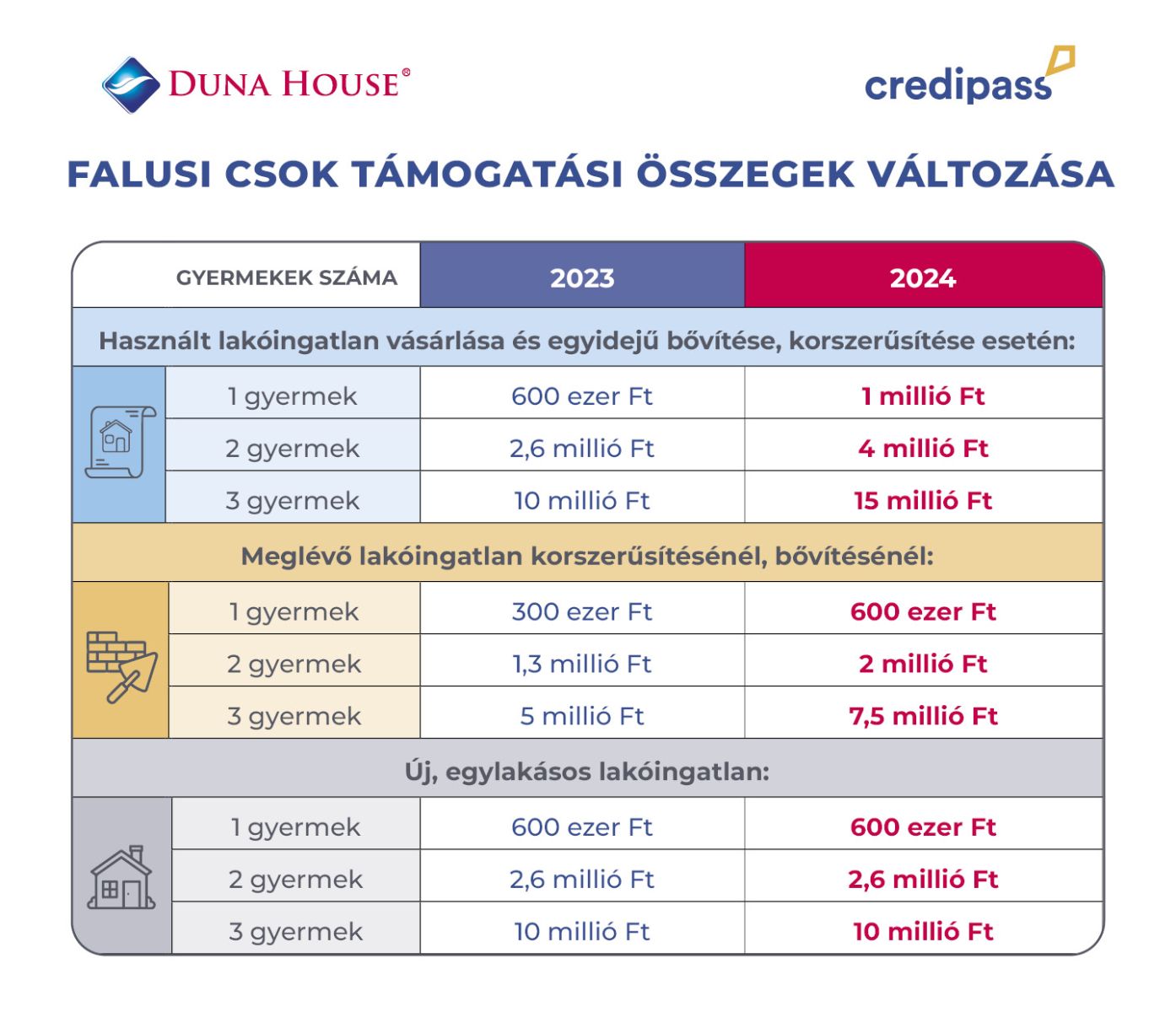 Használt lakóingatlan választásakor, amennyiben a vásárlással egybekötött korszerűsítésre is szükség van, az egy gyermek után felvehető összeg 2024-től 1, két gyermek után 4, három vagy több gyermek után 15 millió forintra változott. Meglévő ingatlan bővítése, korszerűsítése esetén pedig egy gyermek után 600 ezer, két gyermek után 2 millió, három gyermek után 7,5 millió forint támogatást lehet igényelni. Az új, egylakásos lakóház esetében megmaradtak az előző évi támogatási összegek: 600 ezer forint, 2,6 és 10 millió forintos segítséget kaphat a család egy, kettő, illetve három vagy több gyermek vállalása esetén.