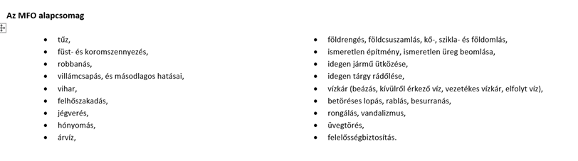 Az úgynevezett Minősített Fogyasztóbarát Otthonbiztosítás (MFO) Alapcsomag elemi károkat, illetve általános, a háztartásokat tipikusan érintő káreseményeket biztosít. Kiegészítő fedezetként a lakáshoz közvetlenül kapcsolódó, gyakoribb káresemények is biztosíthatók, de ezek mellett egyéb, egyedi káresemények biztosítására is van lehetőség.