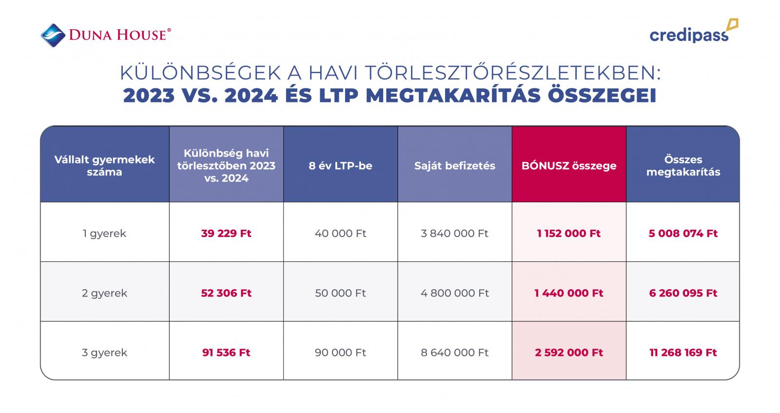 „2023-ban jelenleg egy gyermekes CSOK esetén nem jár kamattámogatott hitel. Egy 15 milliós, 25 éves futamidejű, 7,45%-os piaci lakáshitel esetében a törlesztőrészlet ebben az esetben 110 361 Ft, míg ugyanez 2024-ben a CSOK Plusz támogatással, piaci kiegészítés nélkül is csupán 71 ezer Ft körül alakul. A közel 40 ezer Ft-os különbséget, amelyet jövőre így megspórolhat egy család, érdemes 8 éves lakástakarékpénztári megtakarításra fordítani. Hiszen - a jelenlegi példánál maradva -, több mint 1 millió Ft-os bónusz adódik hozzá a saját befizetésekhez, amely a megtakarítási idő végére összesen mintegy 5 millió Ft-os megtakarítást eredményez.” – mondta el Fülöp Krisztián, a Credipass magyarországi vezetője. „Ez pedig jelentheti egy kisebb lakás vagy vidéki ház megvásárlásához szükséges önerőt, vagy akár teljes energetikai korszerűsítést is.” – tette hozzá.