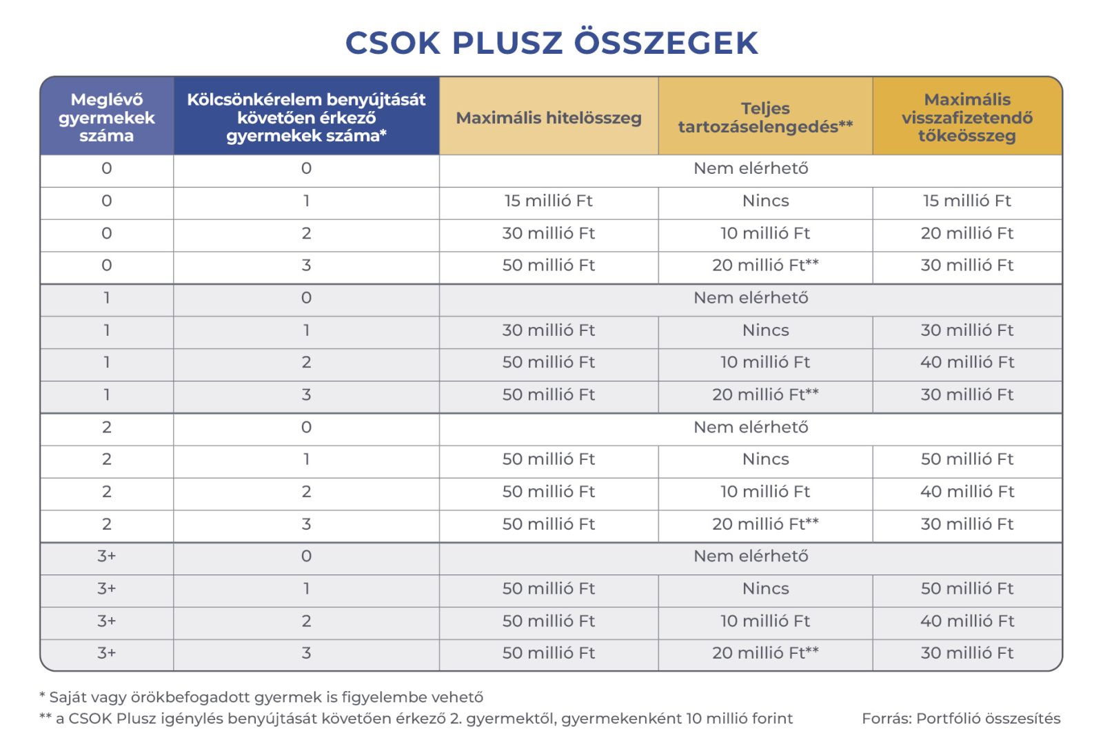 A CSOK Plusz egy kedvezményes, legfeljebb 3 %-os fix kamatozású államilag támogatott hitel, amelyet házaspárok vehetnek igénybe. Feltétele az új gyermek vállalása: tehát azon gyermeket vagy további gyermeket tervező házaspárok igényelhetik a kedvezményes hitelt, akiknél a feleség 41 év alatti, (vagy akár idősebb is lehet, amennyiben 2025 év végéig 12 hetes várandósságát igazolja.) A fix kamatozású hitel a meglévő és vállalt gyermekek összlétszámától függően 15, 30 vagy maximum 50 millió forint lehet, amelyet minimum 10, maximum 25 éves futamidőre vehet fel az ügyfél.